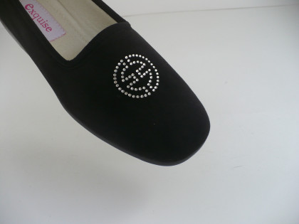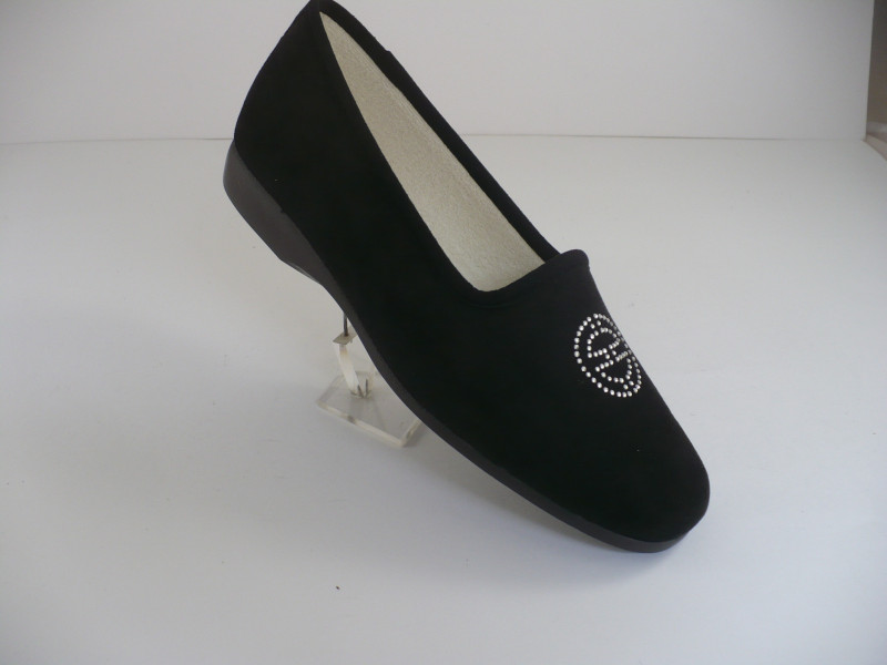 Pantoufle d'intérieur élégante et légère en tissus ALCANTARA noir . Doublure éponge. Signature féminine en strass. Lavable en machine à 30° Marque Française